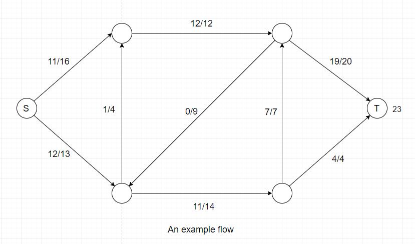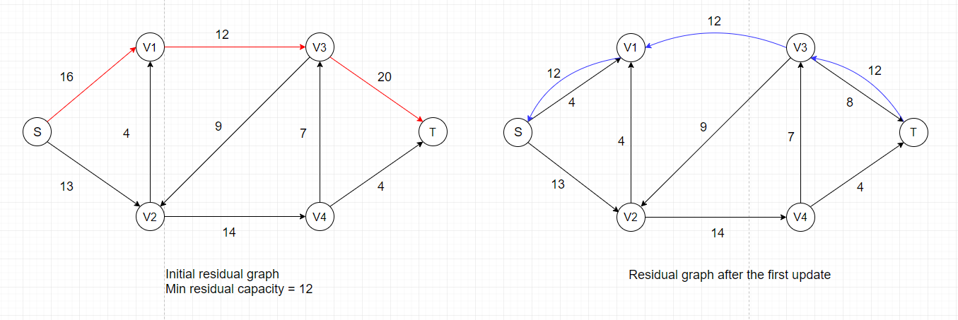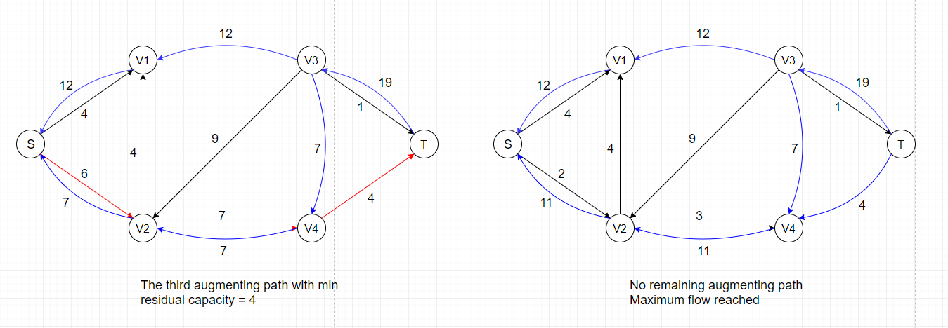For example, there exists an augmenting path: S --> V2 --> V3 --> T, in the residual network above that could increase the overall flow by 4 because the maximum residual capacity along the path is 4 (edge V2-->V3).