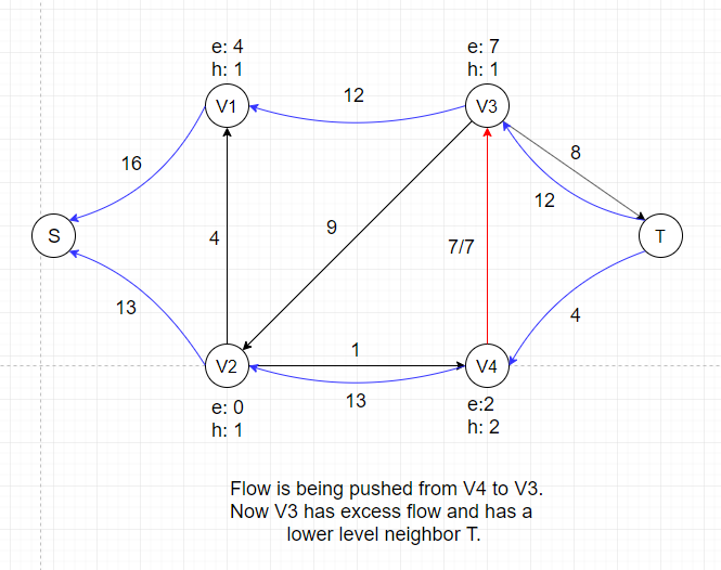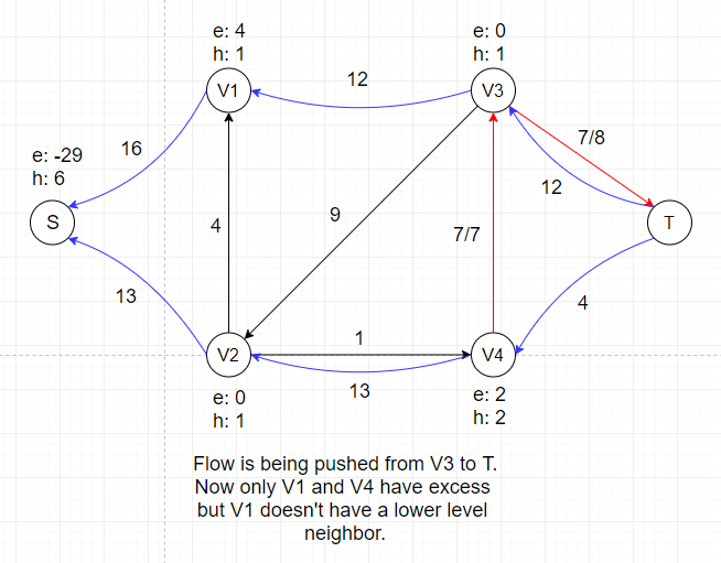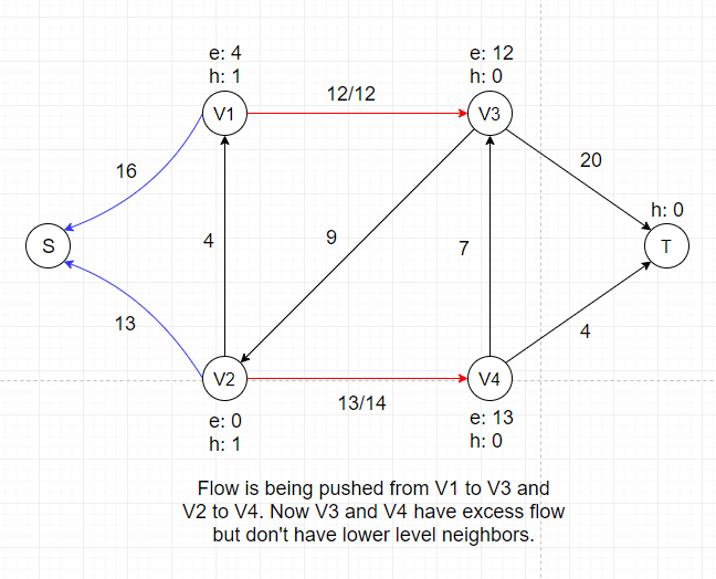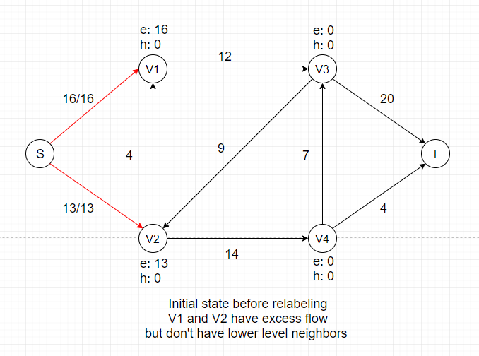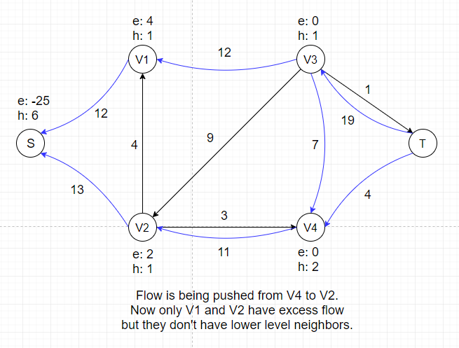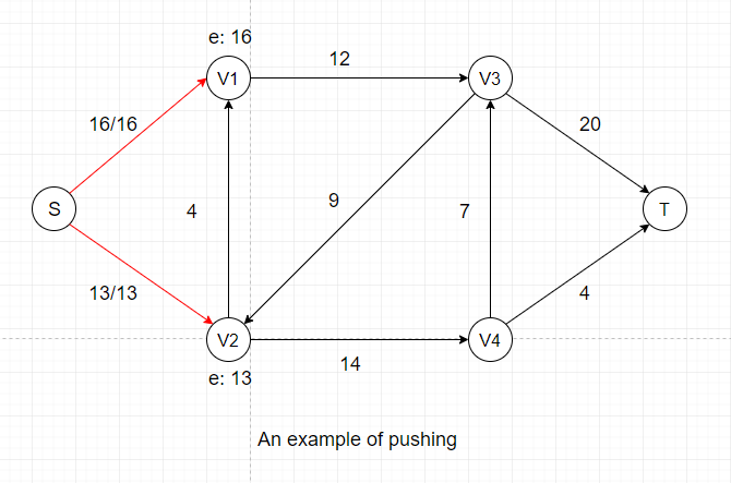 After this push, V1 and V2 each gets certain amount of temporary flow, denoted as e: 16 and e: 13. We can see that all neighbors of V1 and V2