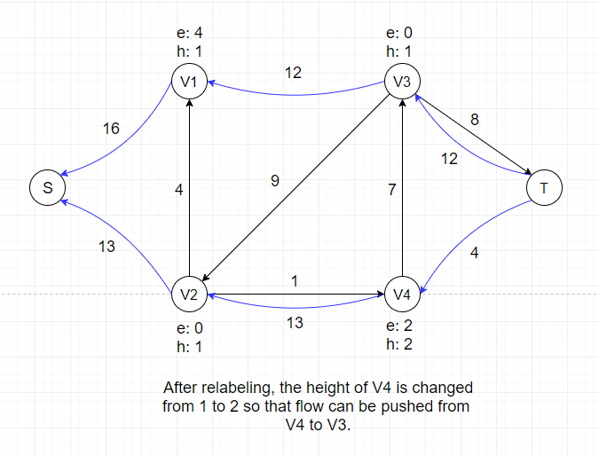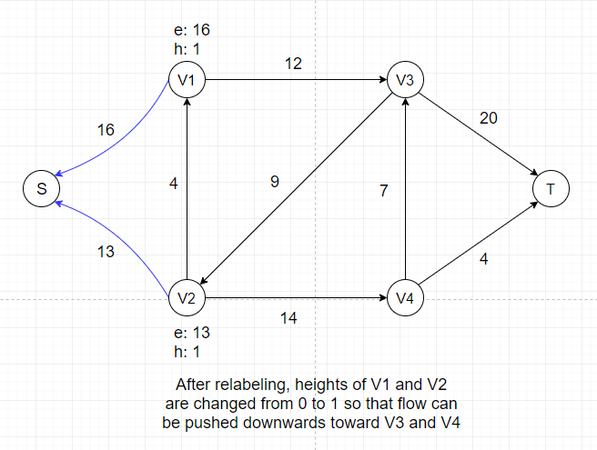 So we cannot push any flow out of V1 and V2 if we don't adjust their heights, which is called the Relabel Operation.