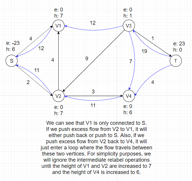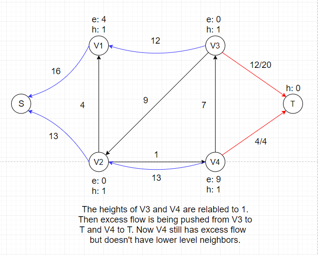 height of vertex u to 1 + min(v.h for all v ∈ N(u)). Since we can only push excess flow from a vertex to its downhill neighbors, adjusting heights of vertices is necessary
