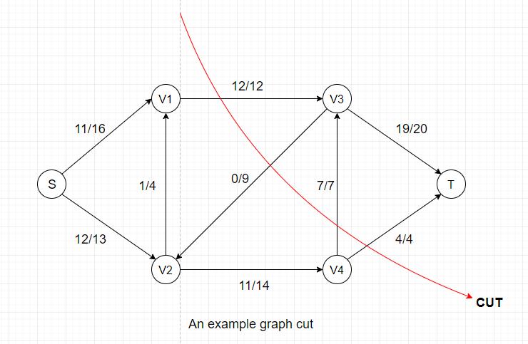 In the example above, the flow for this particular cut = 12(V1-->V3) + 7(V4-->V3) + 4(V4-->T) - 0(V3-->V2) = 23, the capacity = 12(V1-->V3) + 7(V4-->V3) + 4(V4-->T) = 23.