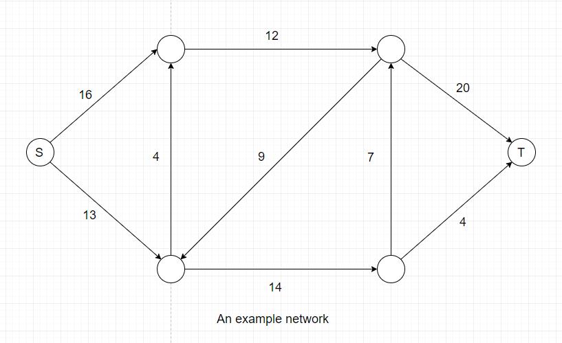 A network is basically a directed graph, with a source vertex that provides material and a target vertex that receives material. The weight of each edge represents the capacity of each possible flow, which means the maximum flow on an edge cannot excede the edge's capacity.
